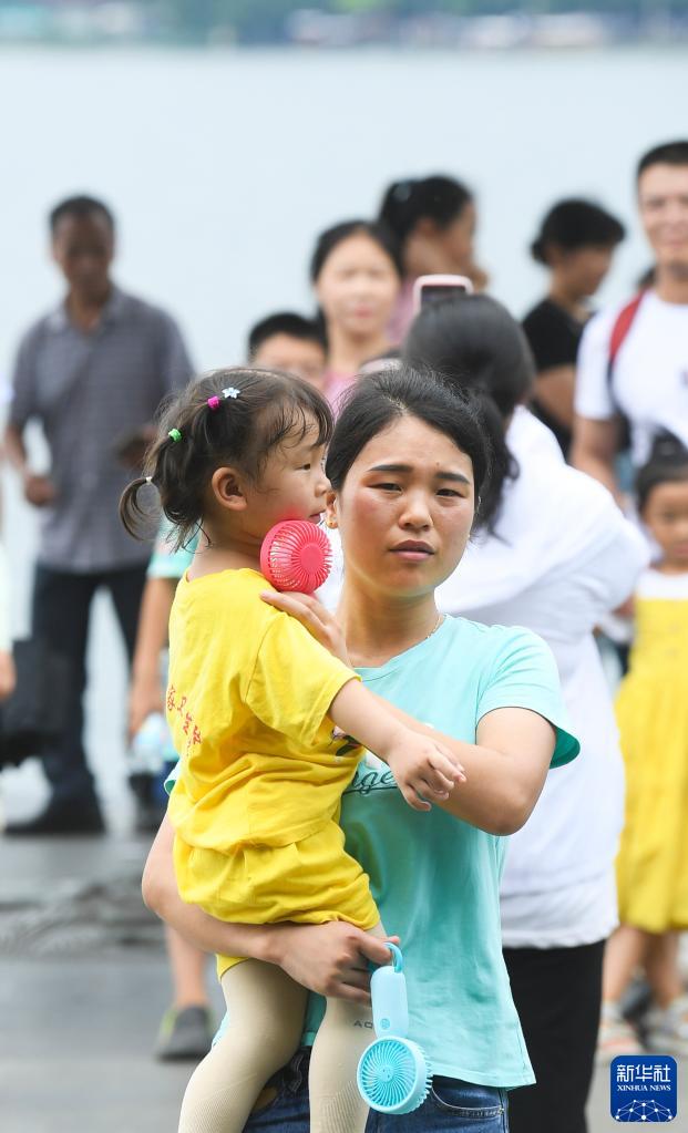 7月10日,在杭州西湖景區,一位母親手持兩個(gè)風(fēng)扇和女兒游玩。