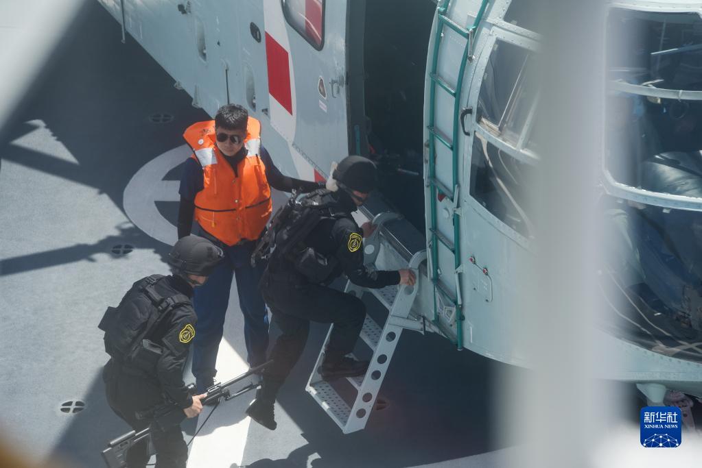 7月10日,中國海軍“和平方舟”號醫院船在太平洋上組織反恐反海盜演練。這是空中打擊組登機起飛。
