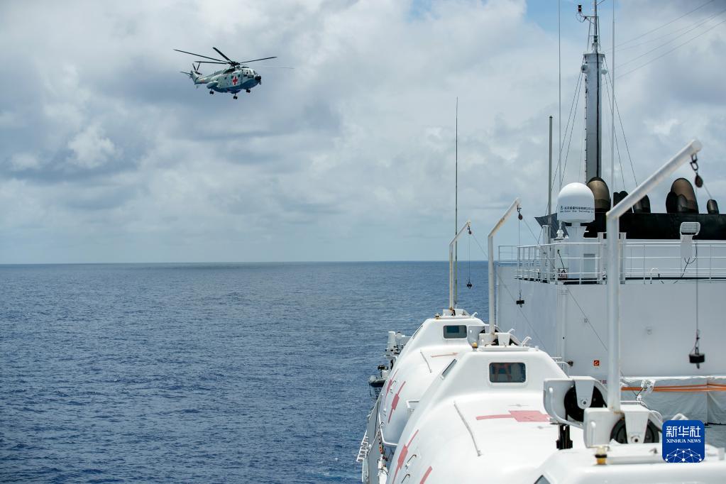 7月10日,中國海軍“和平方舟”號醫院船在太平洋上組織反恐反海盜演練。這是艦載直升機前出查證。