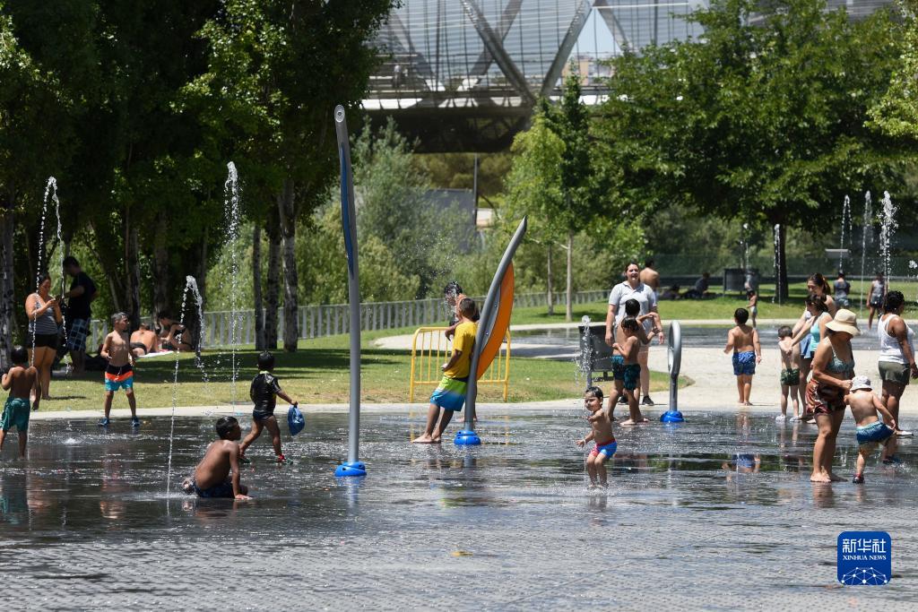 7月10日,人們在西班牙馬德里市區的一處噴泉消暑。