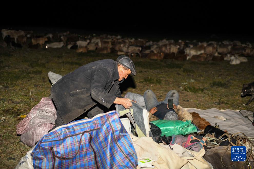 夜色降臨,羊群安靜下來(lái),哈布得拉什么(左)在睡前檢查物品有無(wú)丟失(7月3日攝)。轉場(chǎng)路途艱辛,牧民早已習慣露宿原野。
