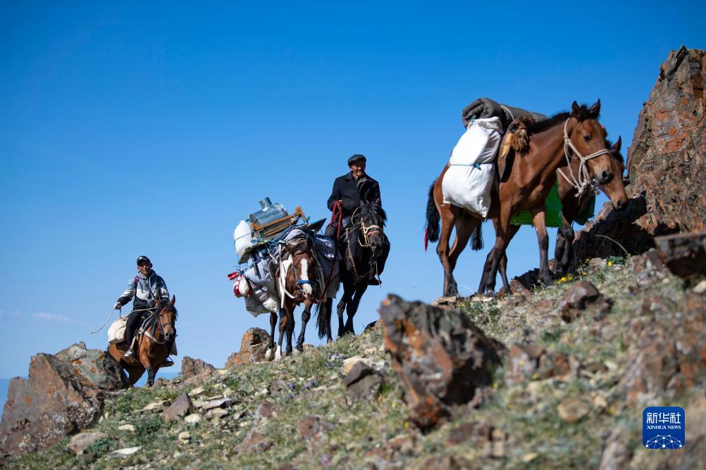 哈布得拉什么(前)和女婿阿依薩騎馬在陡峭的牧道上行進(jìn)(7月4日攝)。