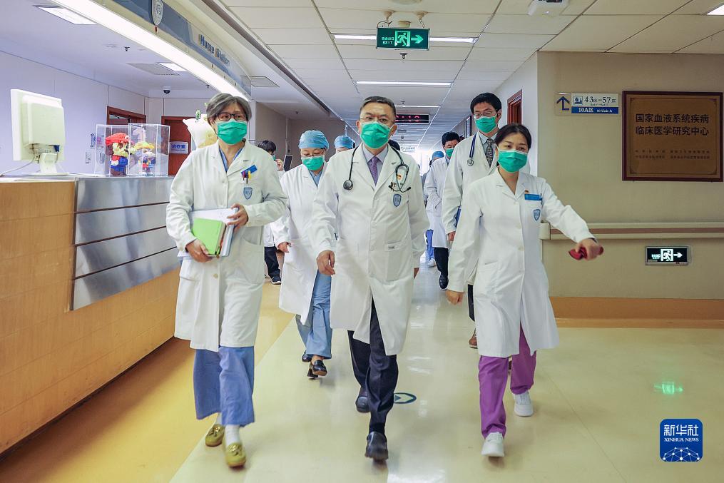 7月3日,黃曉軍(中)帶隊在北京大學(xué)人民醫院血液科病房查房。