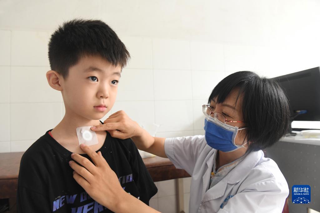 7月11日,河北省石家莊新樂(lè )市中醫院醫務(wù)人員給兒童貼“三伏貼”。
