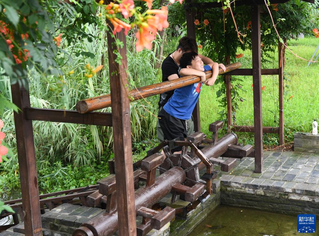 7月11日,游人在穆溝古村體驗踩水車(chē)。
