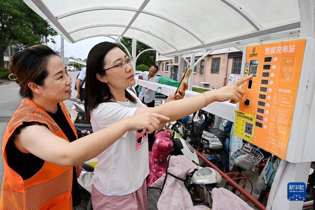 7月11日,在青島膠州市九龍街道一電動(dòng)自行車(chē)集中充電點(diǎn),社區工作人員指導車(chē)主掃碼充電。