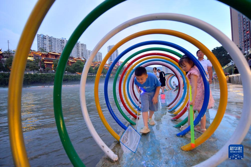 7月10日傍晚,市民和游客在宣恩縣城貢水河畔親水休閑。