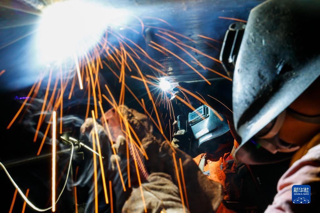 7月9日深夜,工人在渤中19-6凝析氣田一期項目中心平臺作業(yè)現場(chǎng)施工。