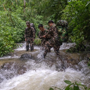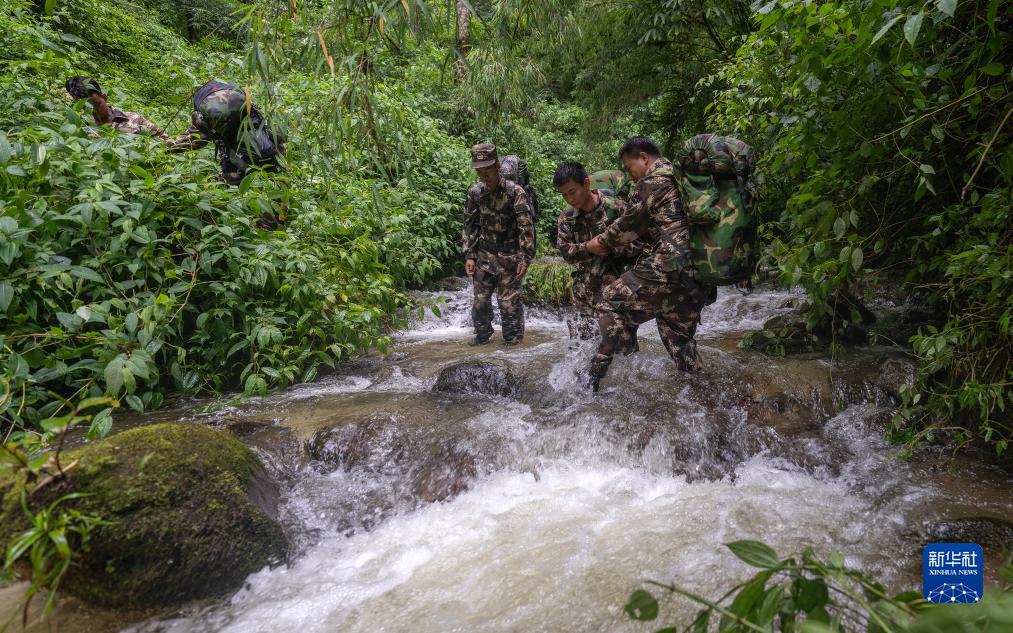 7月8日,在高黎貢山國家級自然保護區,巡護隊員互相幫助蹚過(guò)湍急的溪流。