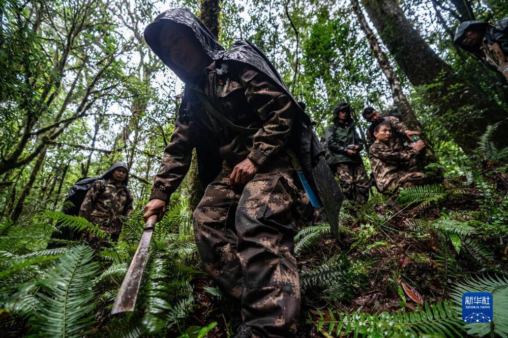 7月9日,在高黎貢山國家級自然保護區,巡護隊員清理紅外相機附近的雜草。新華社記者 江文耀 攝