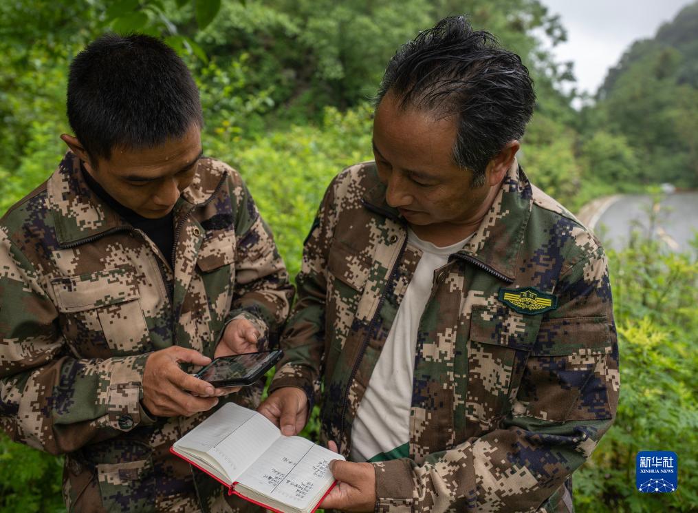 7月8日,何貴品(右)在查看護林員喬新華記錄的菲氏葉猴的行動(dòng)軌跡。新華社記者 費茂華 攝