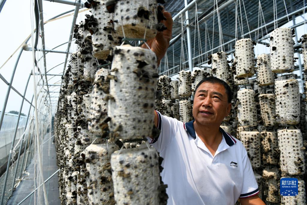7月11日,在內蒙古扎蘭屯市扎蘭屯黑木耳產(chǎn)業(yè)孵化園區內,工作人員在采摘黑木耳。