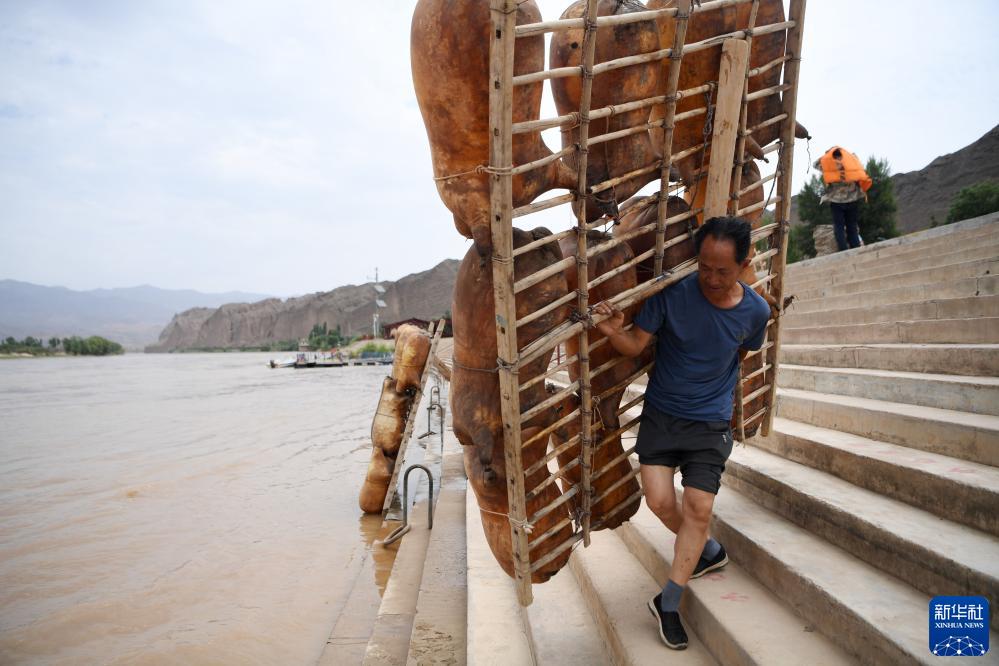 一名筏子客在黃河石林景區背著(zhù)羊皮筏子準備漂流(7月11日攝)。