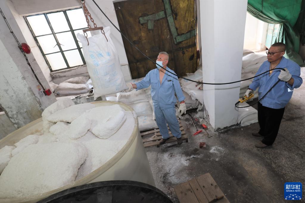 7月11日,鐵路上海站綜合車(chē)間司爐工在為離子交換器鹽池進(jìn)行加鹽作業(yè)。