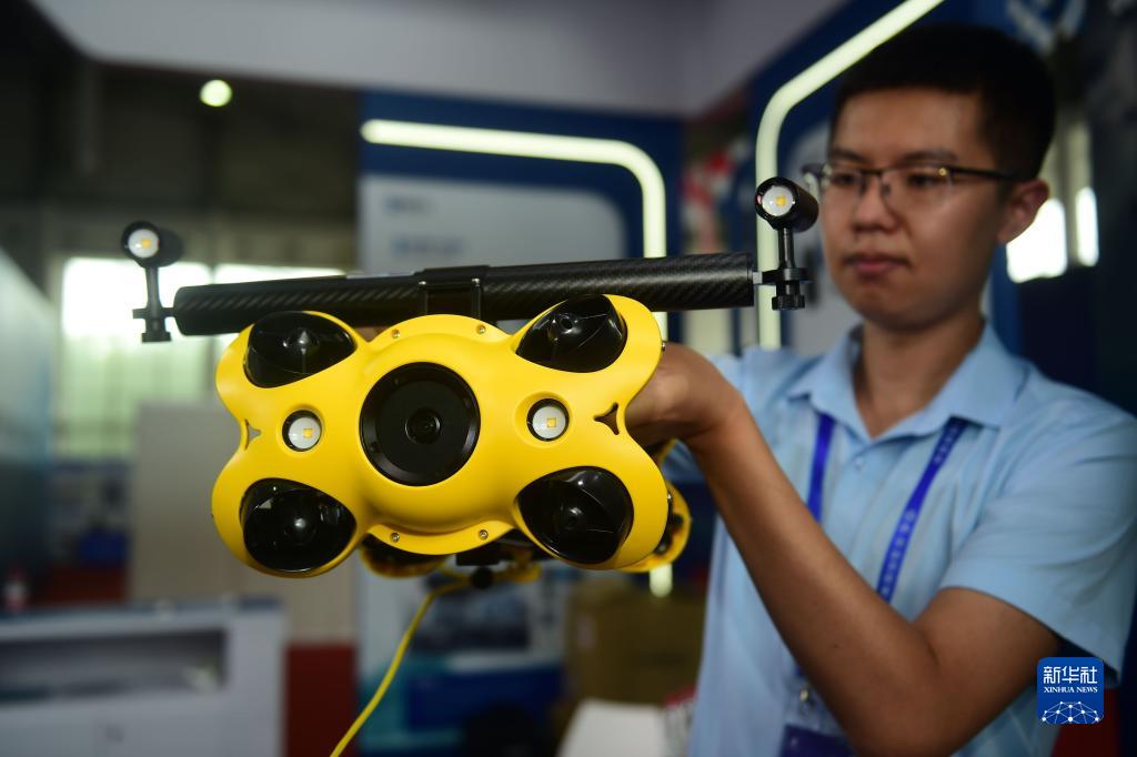 7月12日,參展單位工作人員展示用于船檢的智能水下機器人。