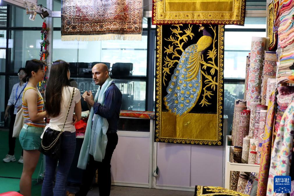 7月12日,一名來(lái)自巴基斯坦的展商(右)在展位與參觀(guān)者交流。
