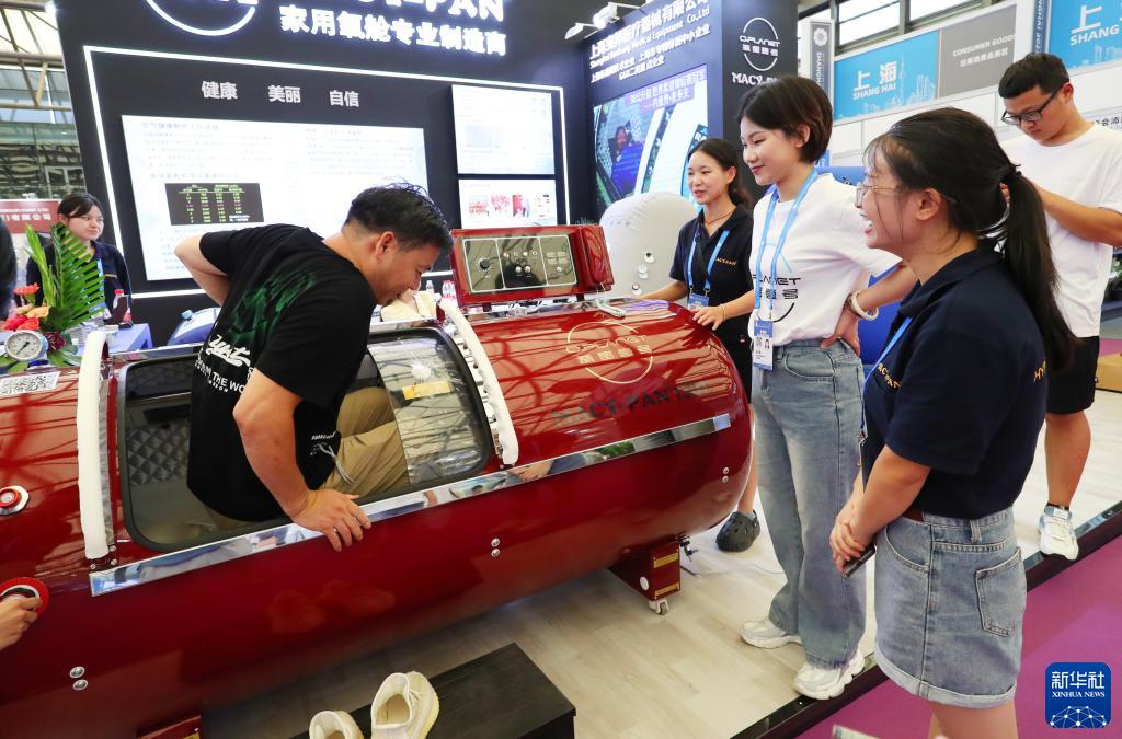 7月12日,一名參觀(guān)者(左)在展會(huì )現場(chǎng)體驗一款家用氧艙產(chǎn)品。