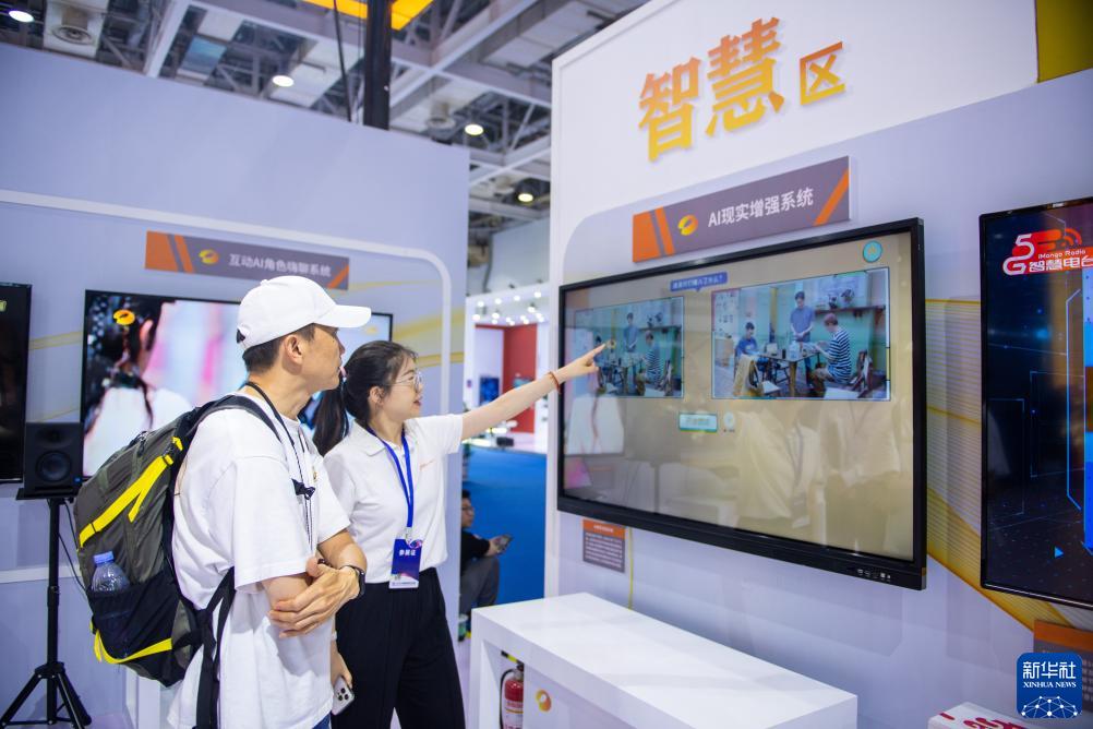 7月12日,參展商(右)在中國新媒體技術(shù)展上向參觀(guān)者介紹AI現實(shí)增強系統。