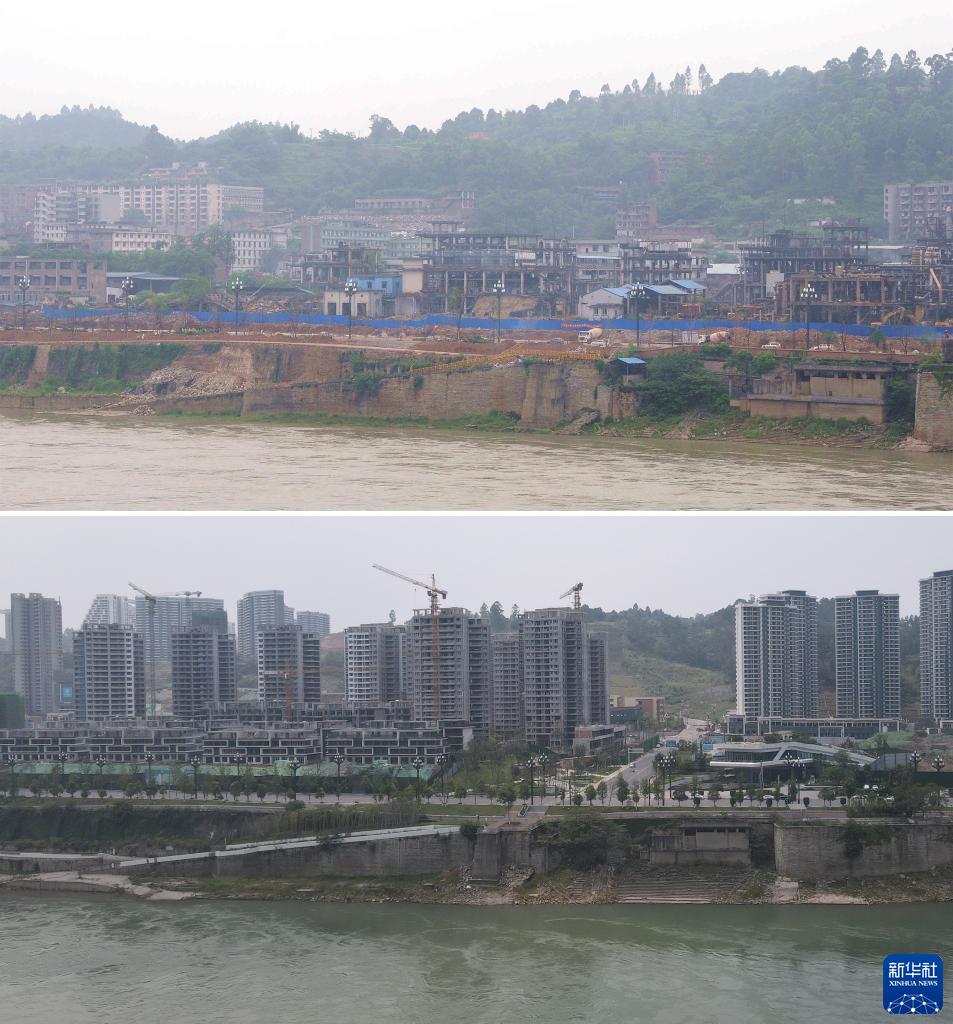 拼版照片:上圖為2018年6月22日,宜賓天原化工廠(chǎng)老廠(chǎng)區的一片廠(chǎng)房正被拆除(新華社記者胡旭攝);下圖為2023年5月31日拍攝的原宜賓天原化工廠(chǎng)老廠(chǎng)區舊址新貌(無(wú)人機照片,新華社記者劉坤攝)。