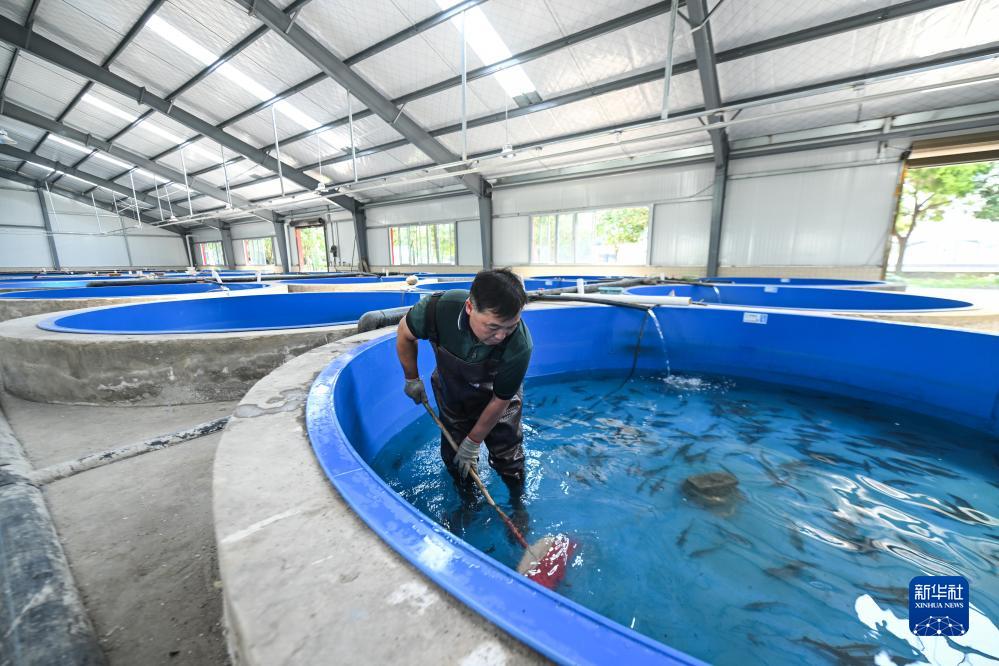 2023年6月27日,在宜賓珍稀水生動(dòng)物研究所與四川省農科院水產(chǎn)研究所合作的繁育基地,周亮在清理長(cháng)江鱘幼魚(yú)池。新華社記者 王曦 攝