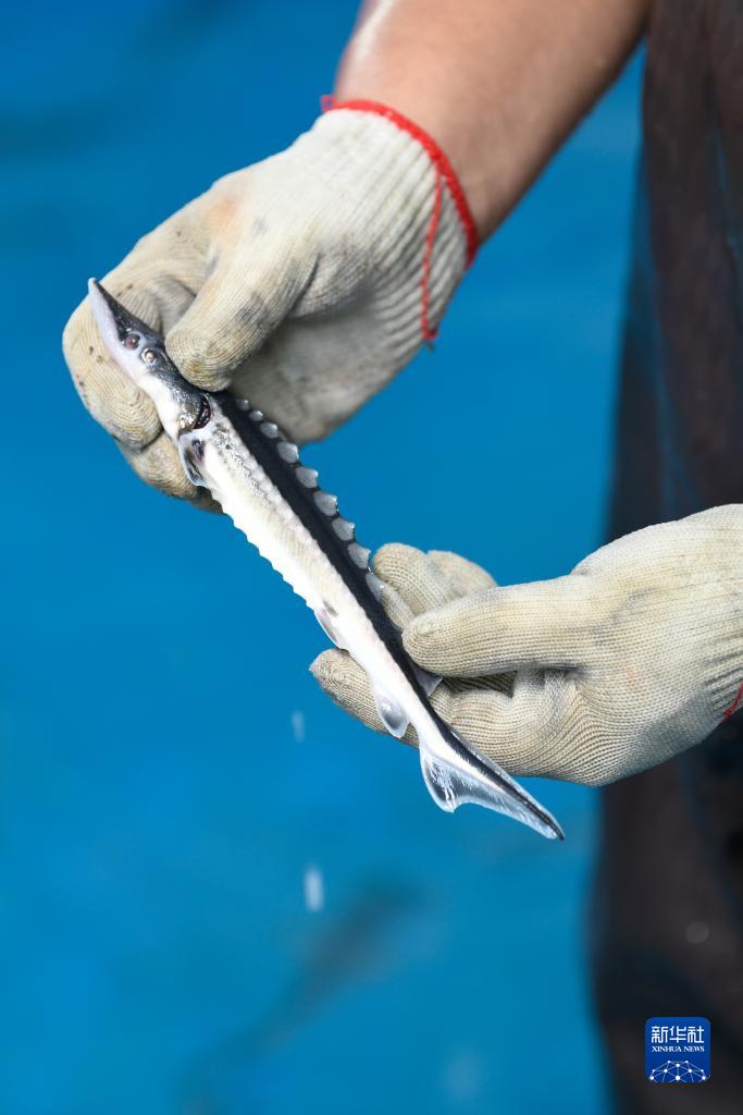 2023年6月27日,在宜賓珍稀水生動(dòng)物研究所與四川省農科院水產(chǎn)研究所合作的繁育基地,周亮展示用于增殖放流的長(cháng)江鱘幼魚(yú)。新華社記者 胥冰潔 攝