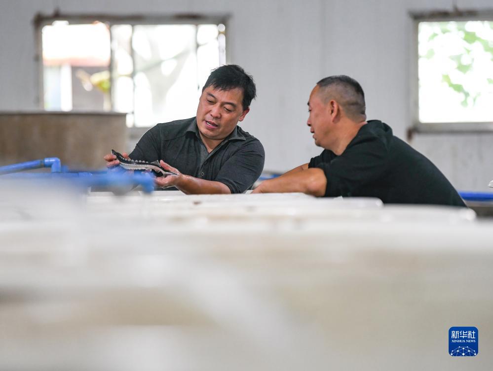 2021年10月12日,在宜賓珍稀水生動(dòng)物研究所與四川省農科院水產(chǎn)研究所合作的繁育基地,周亮(左)和同事查看長(cháng)江鱘幼魚(yú)的生長(cháng)情況。新華社記者 王曦 攝