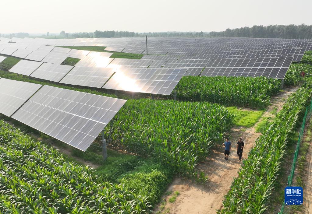 7月11日,在遼寧省彰武縣馮家鎮哈大冷村,村民經(jīng)過(guò)太陽(yáng)能光伏發(fā)電設備(無(wú)人機照片)。