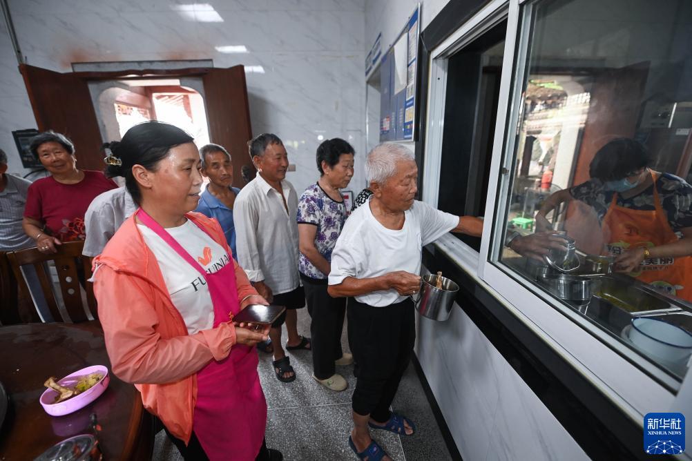 7月13日,老人們在湍口鎮迎豐村老年食堂打飯。這個(gè)老年食堂的建設得益于新鄉賢們的捐贈相助。