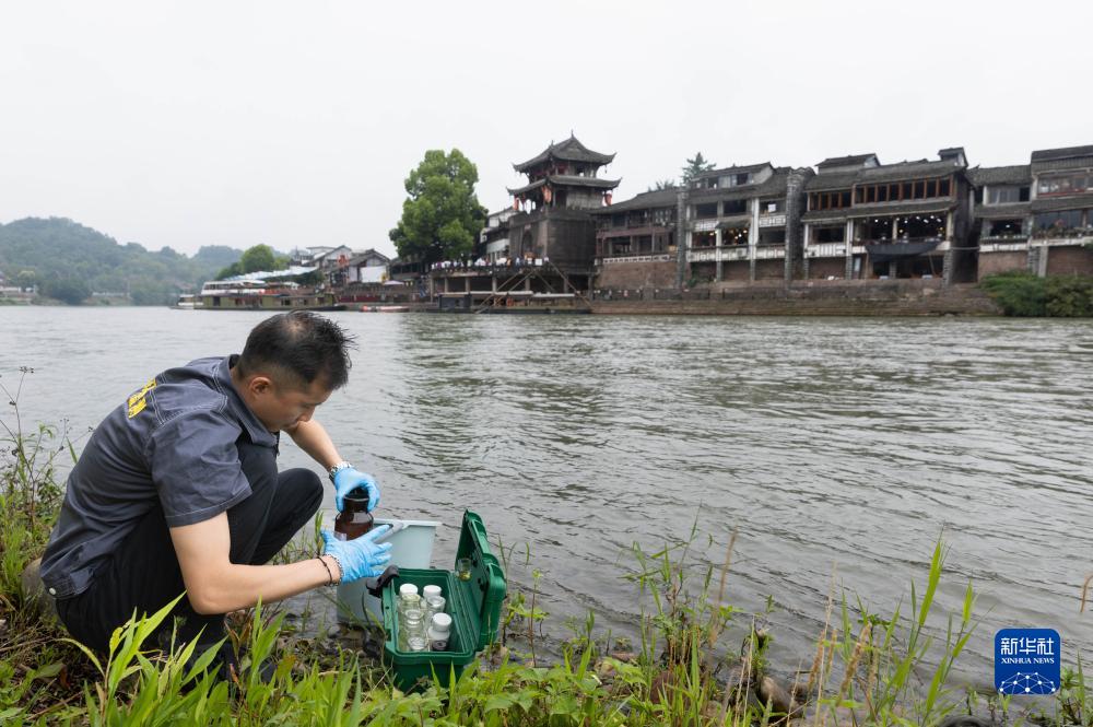 成都市生態(tài)環(huán)境監測中心站現場(chǎng)監測人員楊超在錦江黃龍溪古鎮段提取水樣(6月15日攝)。黃龍溪古鎮是錦江流出成都的出境地。新華社記者 江宏景攝