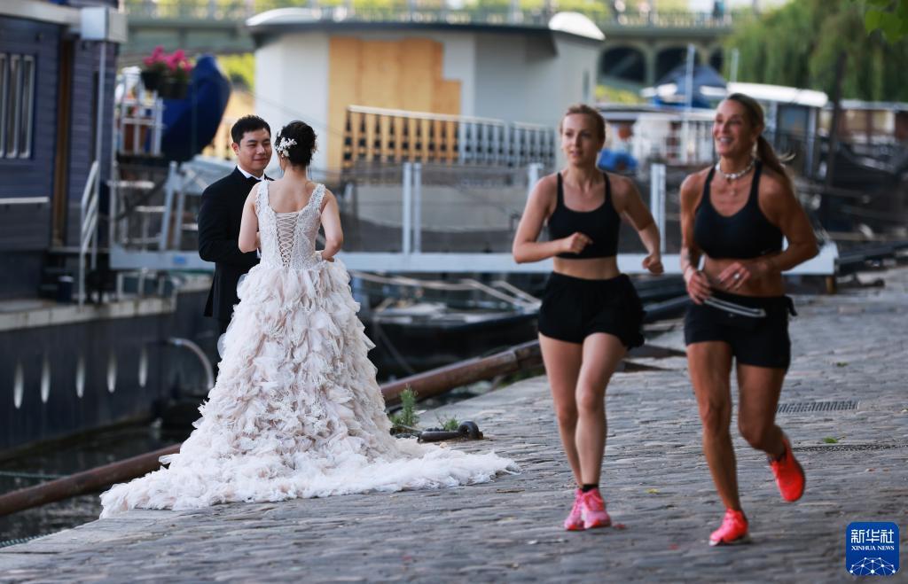 這是一對來(lái)自中國的新人在法國巴黎塞納河邊拍攝婚紗照(6月27日攝)。