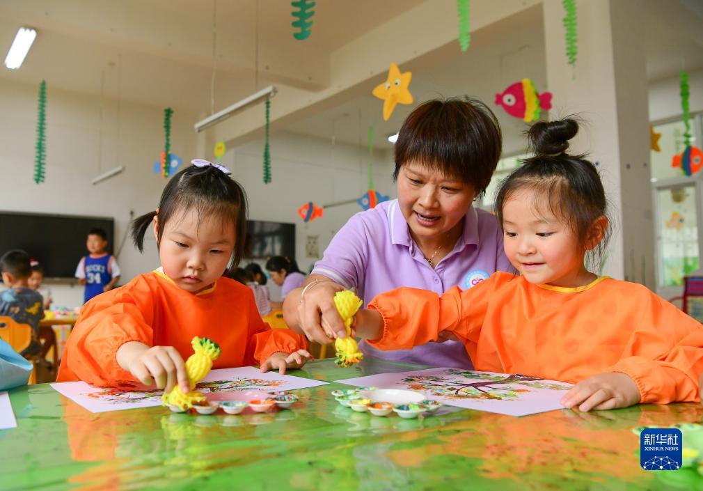 7月13日,在安徽省合肥市肥西縣山南鎮中心幼兒園,小朋友在老師的指導下作畫(huà)。
