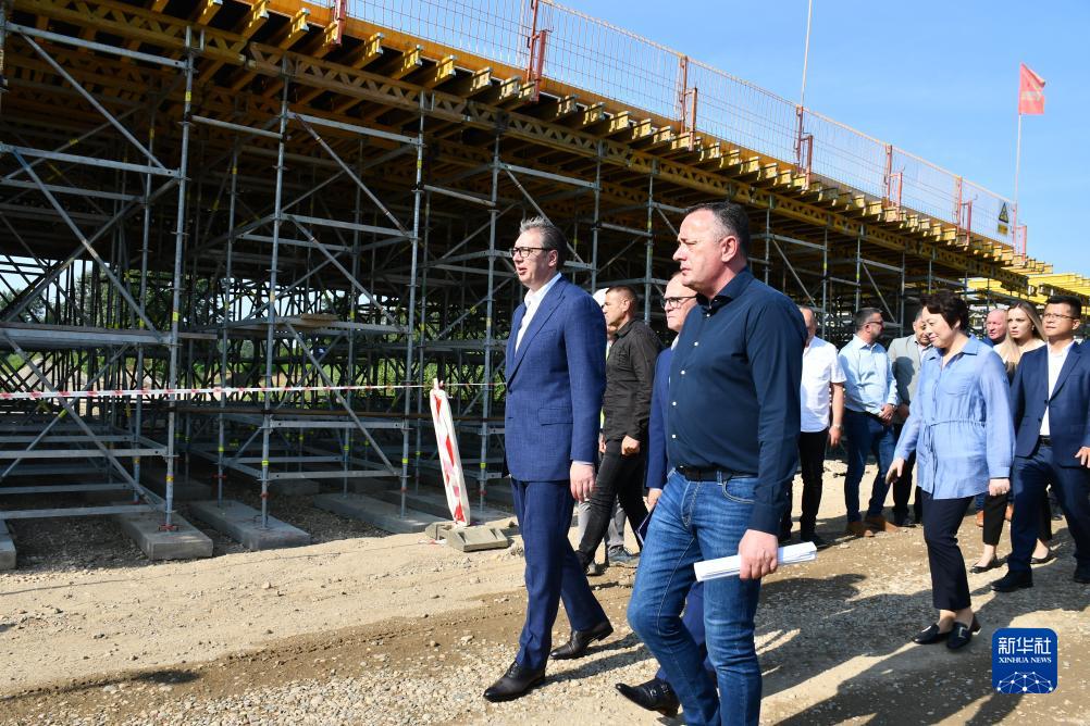 7月12日,在塞爾維亞?wèn)|部城市波扎雷瓦茨,塞爾維亞總統武契奇(左一)視察中企承建的波扎雷瓦茨至戈盧巴茨快速路施工現場(chǎng)。