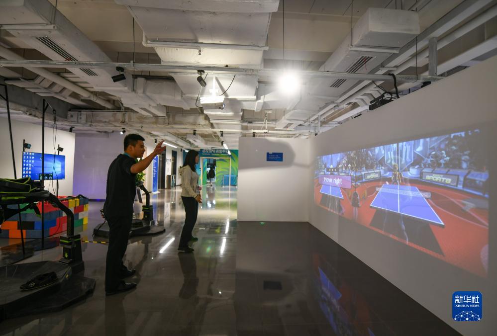 7月13日,在成都大運會(huì )主媒體中心的休閑娛樂(lè )區,兩名媒體記者在體驗互動(dòng)投影乒乓球。