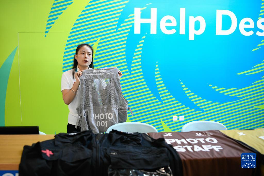 7月14日,工作人員在成都大運會(huì )主媒體中心媒體服務(wù)區展示攝影記者背心。