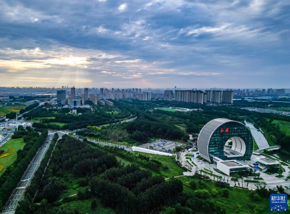 7月13日無(wú)人機拍攝的晨曦中的一汽紅旗創(chuàng )新大廈。