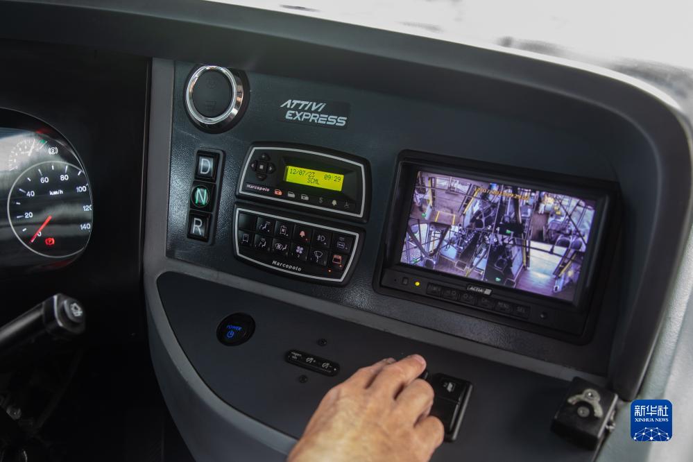 7月12日,在巴西圣保羅州圣若澤杜斯坎普斯,工作人員在比亞迪純電動(dòng)大巴上調試設備。