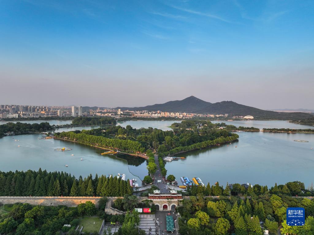 南京明城墻玄武門(mén)、玄武湖與紫金山景色(無(wú)人機照片,6月9日攝)。
