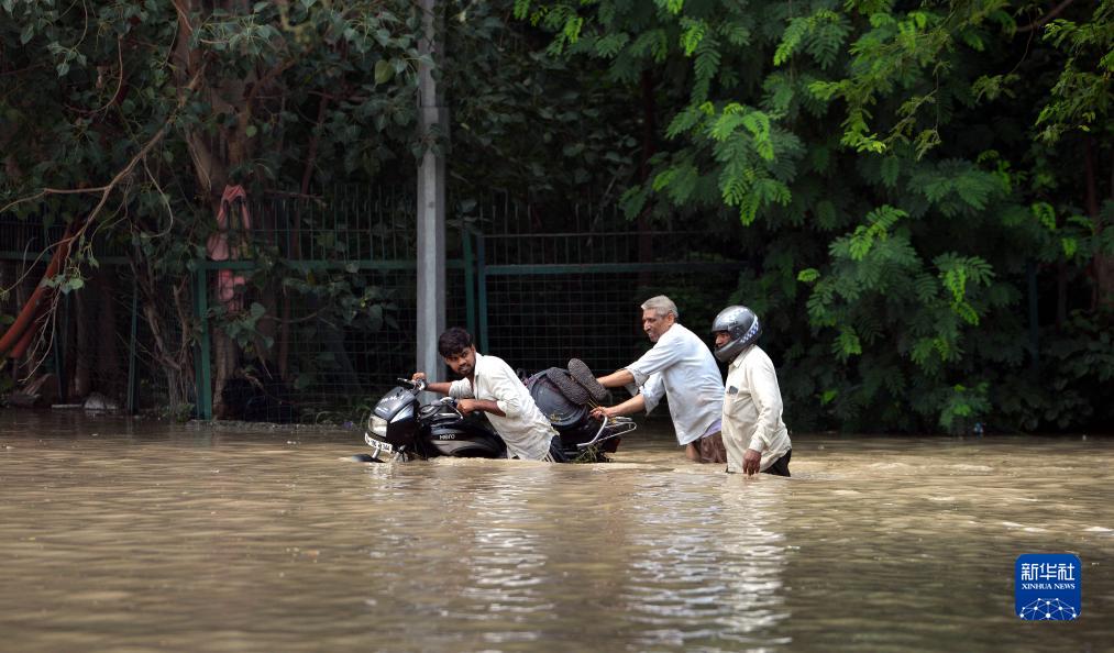 連續強降雨導致亞穆納河水位上漲,新德里部分地區被淹,市民出行和日常生活受到影響,低洼區受災居民排隊領(lǐng)取生活物資。