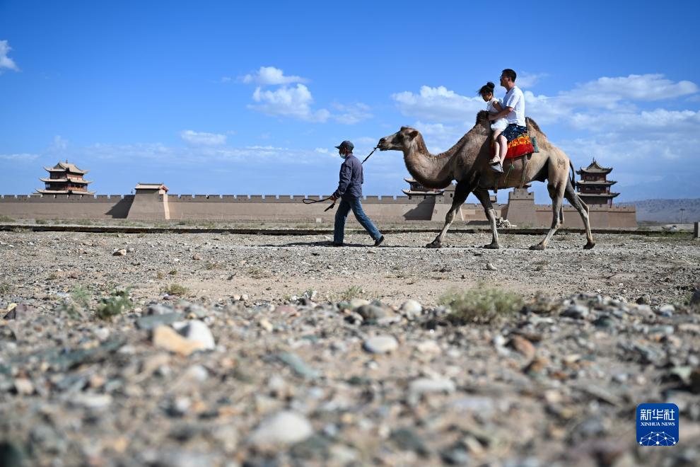 游客在嘉峪關(guān)關(guān)城景區體驗騎駱駝(7月13日攝)。