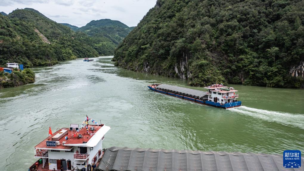 集裝箱貨輪從貴州省遵義市余慶縣沙灣碼頭駛出,前往重慶涪陵黃旗港(7月14日攝,無(wú)人機照片)。