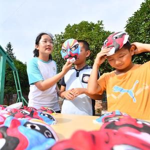 7月14日,在三江侗族自治縣知了小學(xué),孩子們在展示自己的臉譜作品。