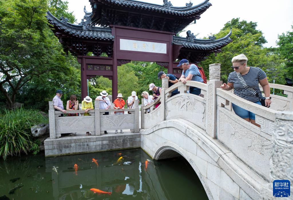 7月14日,游客在德國曼海姆的路易森公園內參觀(guān)中國園林“多景園”。
