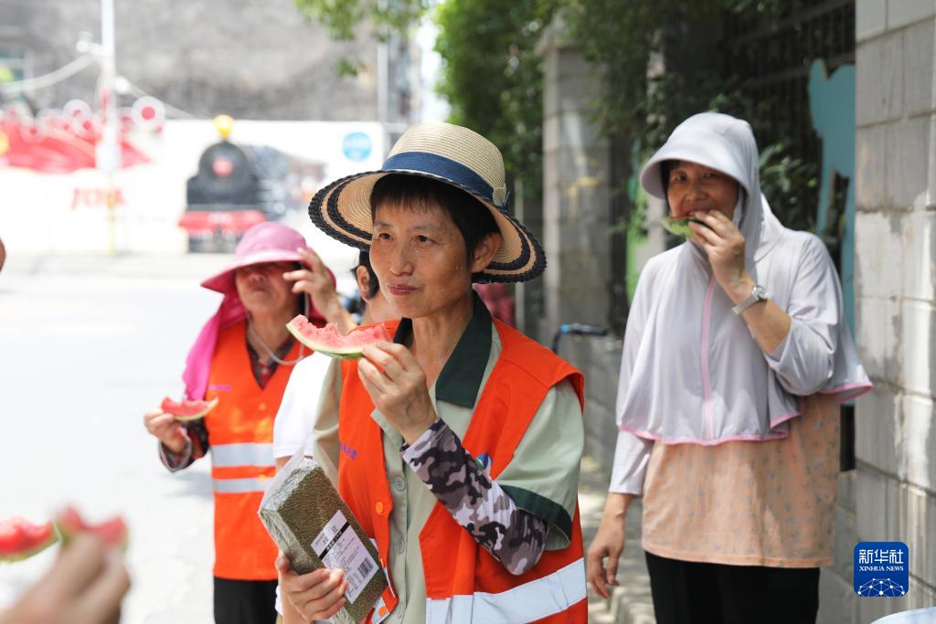 在江西南昌青山湖區站東街道,環(huán)衛工人吃西瓜補充水分(7月14日攝)。