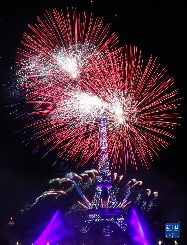 7月14日,焰火在法國巴黎埃菲爾鐵塔周?chē)`放。