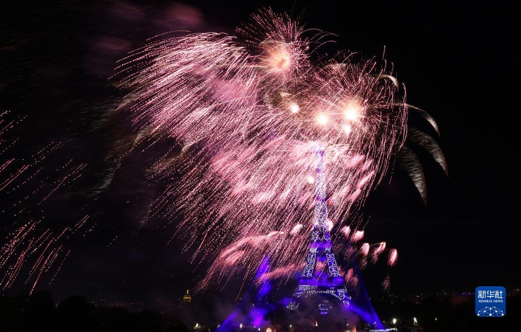 7月14日,焰火在法國巴黎埃菲爾鐵塔周?chē)`放。