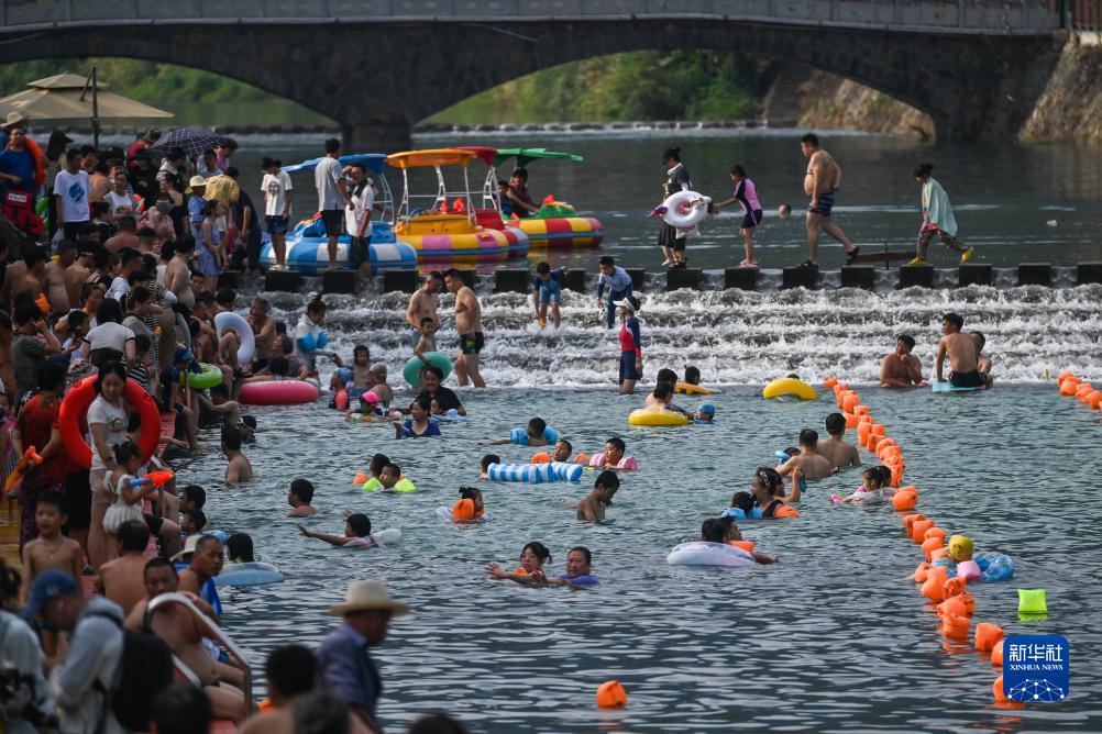 7月14日,游客和村民在乾潭鎮下包村胥溪天然泳場(chǎng)戲水,感受夏日清涼。