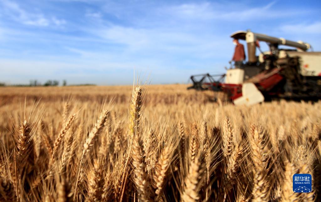 山東省臨沂市平邑縣地方鎮農民駕駛收割機在田間收割小麥(6月5日攝)。