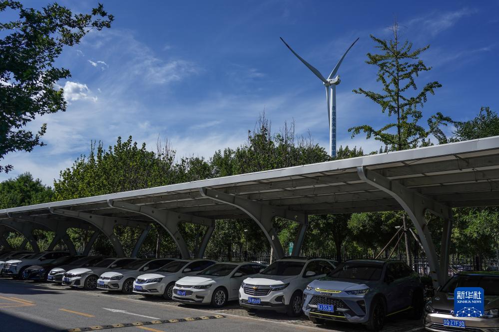 7月14日拍攝的配有光伏設備的停車(chē)區,遠處是風(fēng)力發(fā)電設備。
