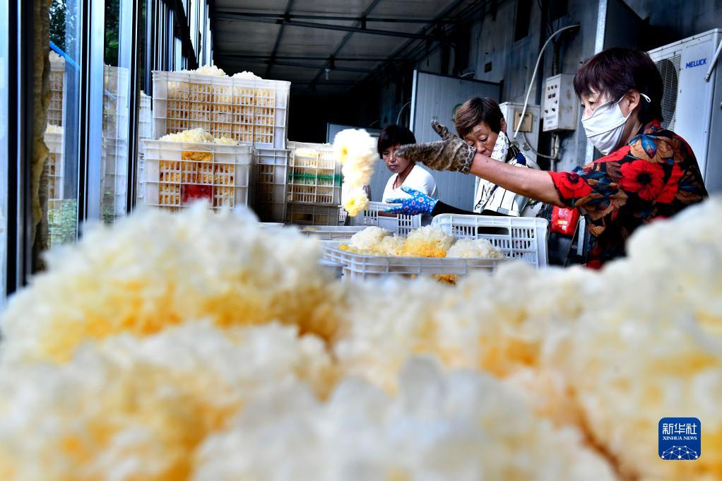 7月15日,在惠民縣胡集鎮銀豐食用菌種植合作社,工作人員在整理新采摘的銀耳。