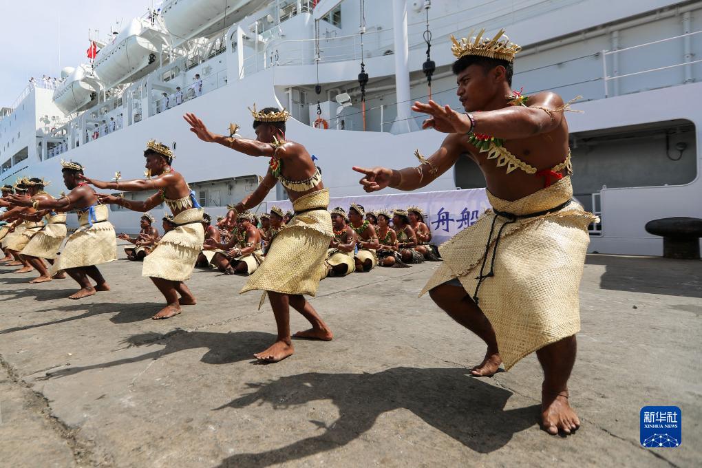 7月15日,中國海軍“和平方舟”號醫院船抵達基里巴斯塔拉瓦,當地民眾表演特色舞蹈歡迎“和平方舟”號來(lái)訪(fǎng)。